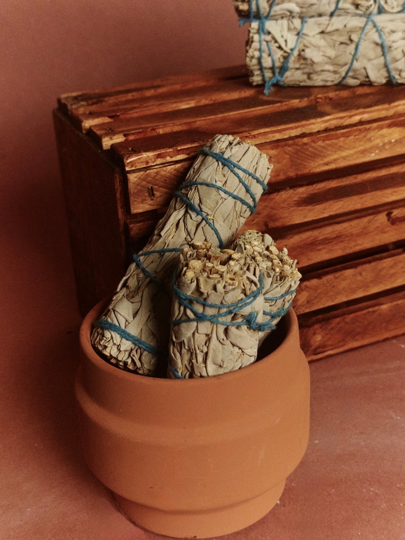 Light the tip until it smolders, then gently blow out the flame. Move the bundle slowly through your space, allowing the smoke to drift. Always use a fireproof dish and never leave unattended.